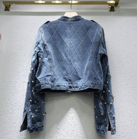Women's Denim Jacket O-neck Embroidered Flares Diamond Pearls Buttons Plaid Elegant Coat Autumn