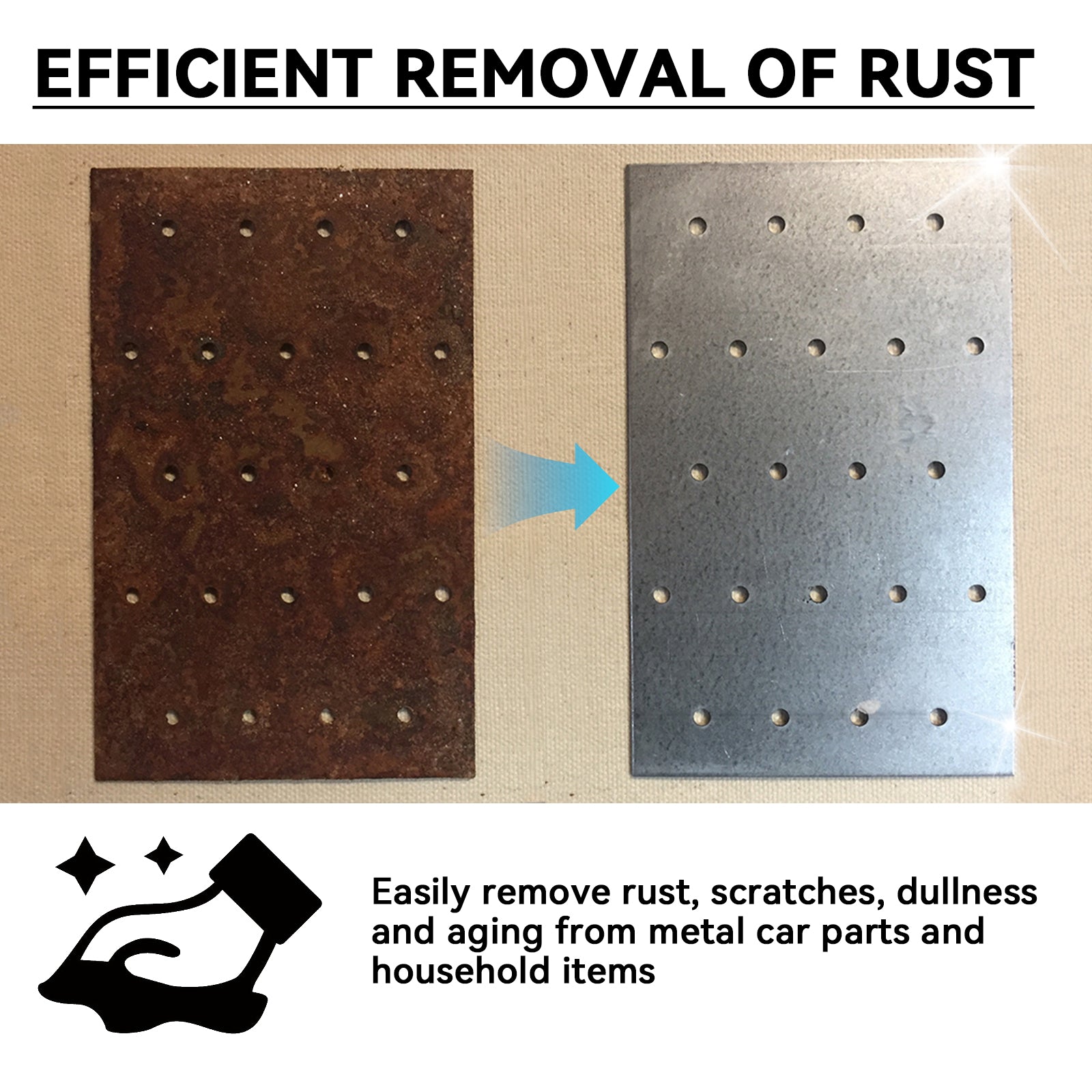 Our rust remover contains deionized water, lemon extract, glycerin. It can easily remove rust, scratches, passivation and aging metal auto parts and household items. Its use method is very simple: first clean the dust and debris on the metal surface, take an appropriate amount of this product on the dry rag, wipe evenly on the surface, remove rust. After use, a dense protective film is formed on the surface of the object to prevent stains and future oxidation rust and maintain the luster of the object.