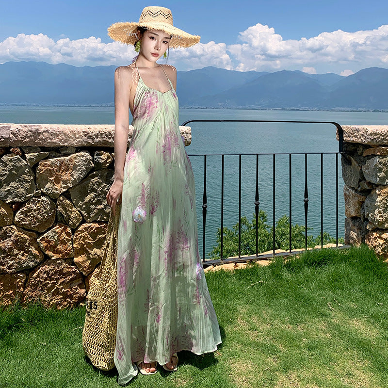 cette robe vert tige pastel parsemée de fleurs violettes évoque un jardin suspendu. Parfaite pour flâner, voyager ou rêver sans un bruit.